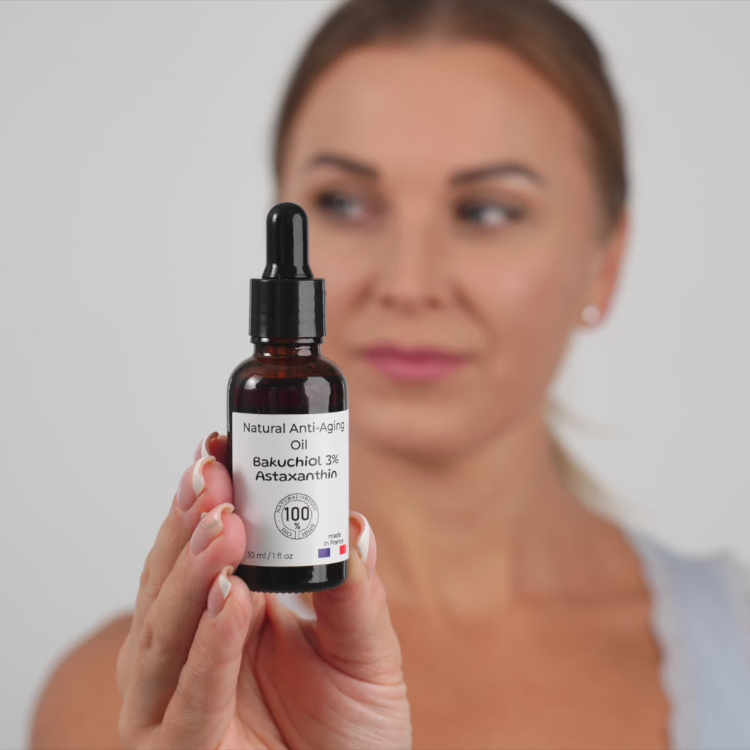 Aceite facial renovador y reafirmante 100% de origen natural, formulado con bakuchiol al 3%, astaxantina —el antioxidante natural más potente— y escualano vegetal. Una combinación diseñada para mejorar textura, firmeza y uniformidad sin irritaciones ni sensibilización.